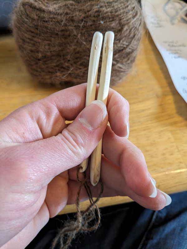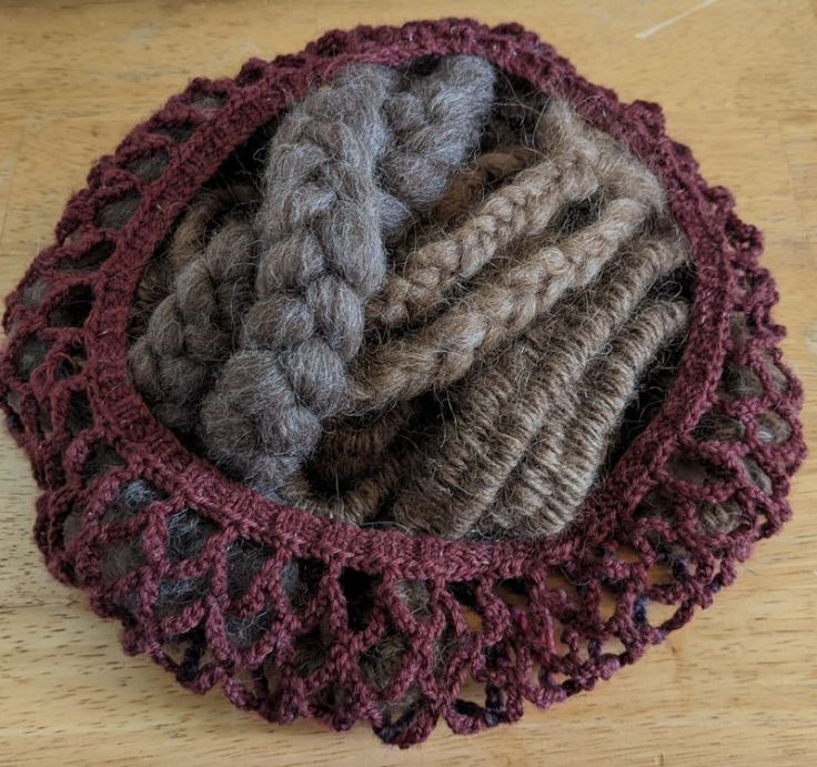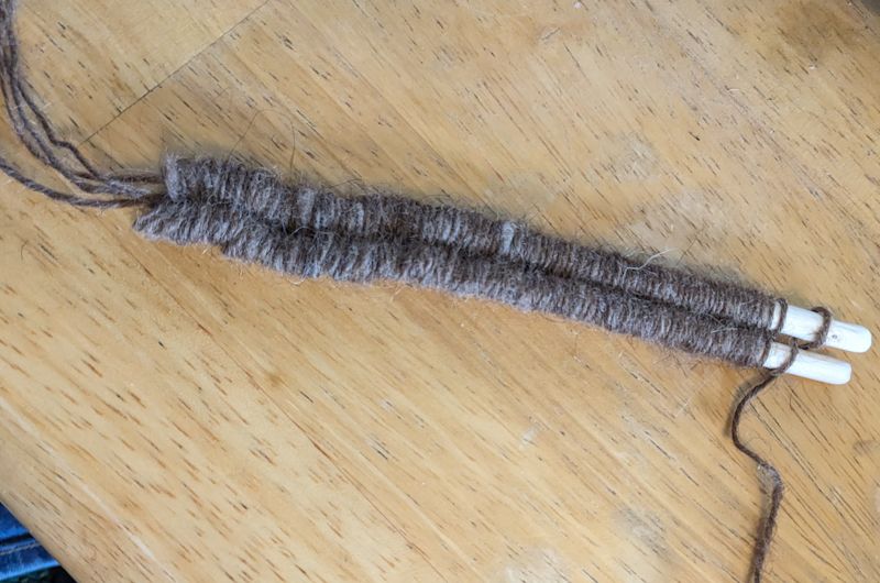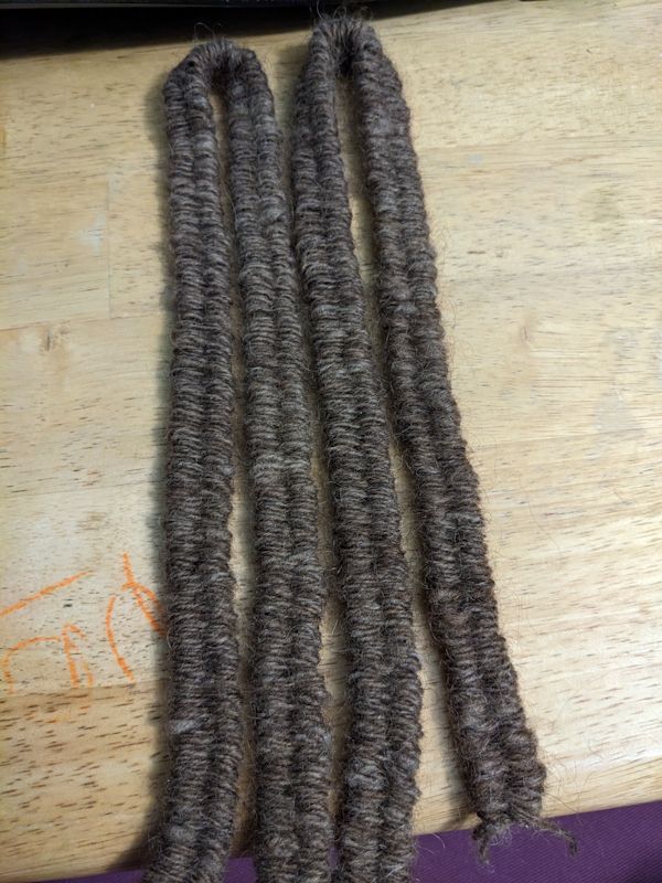 Wool braids inside the net are made from brown Coopworth wool top I had in my stash. I tried a couple different kinds of wool, but ultimately that one resulted in the best color and size.
