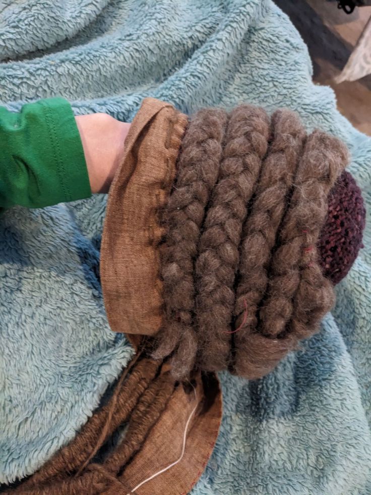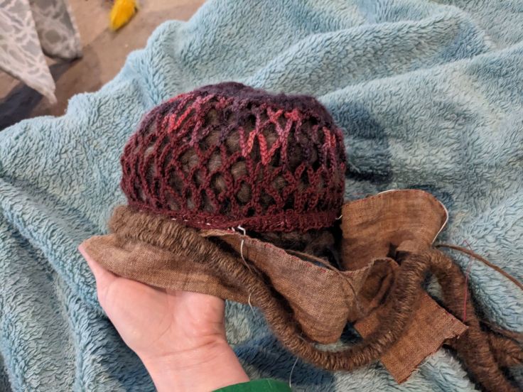 My friend Cassair Ni Deoraine suggested sewing the braids to the net rather than trying to make a hairpiece that would need to be pinned to my head. It worked beautifully, and now this headpiece is like a comfy hat/pillow and doesn’t require pinning anything to stay in place!