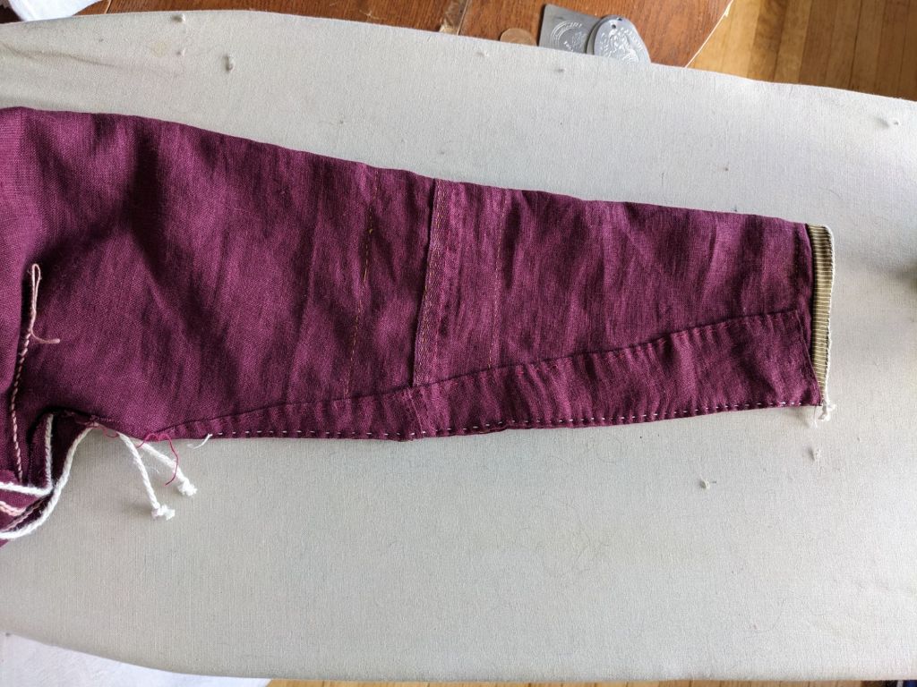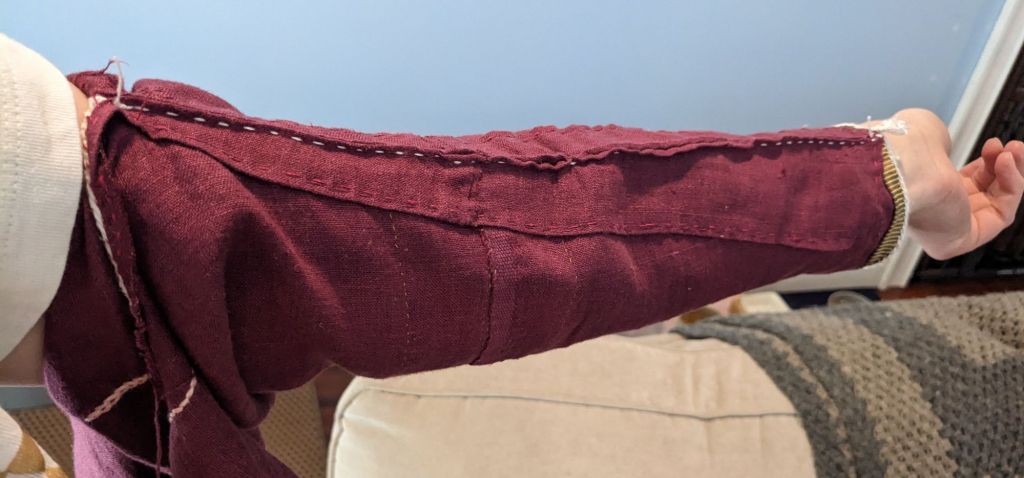 The construction method helps me out with fixing that when I have time — I can unstitch the seam and the triangle folds, put in a tuck to take up a bit of the upper sleeve area, and then sew new folds and a new seam to close up the sleeve. I will try that and see if it works better!