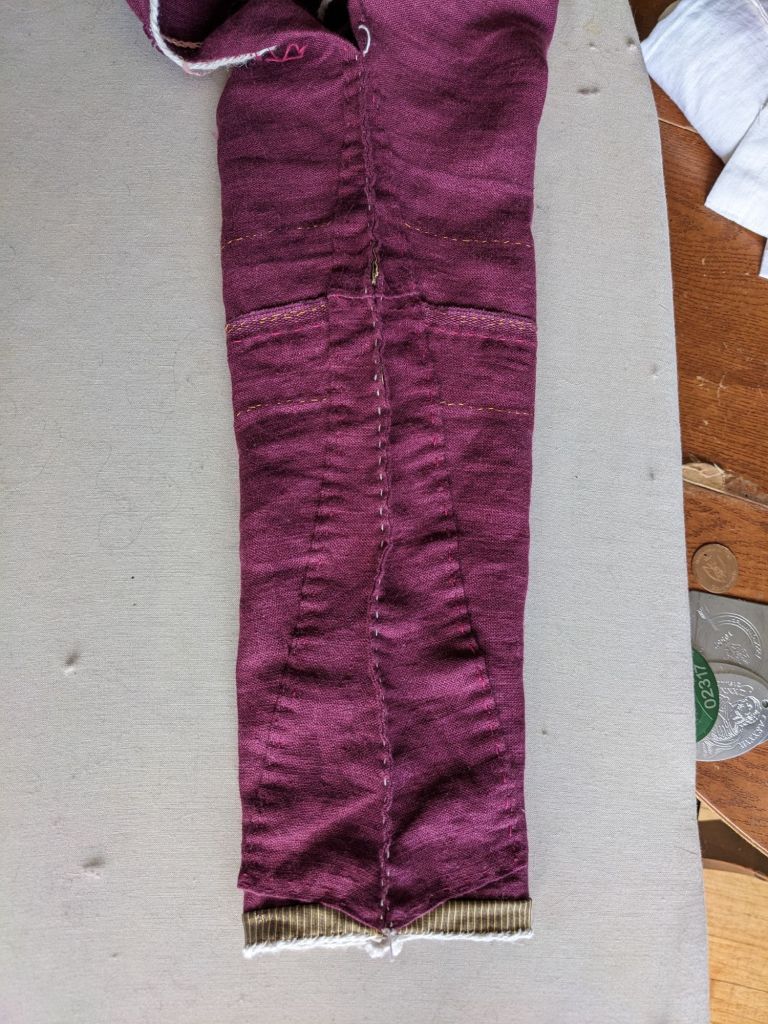 For the sleeve style of my “Buy Nothing” project tunic, there were a few different options — sleeveless, short sleeves, long sleeves that are wide, and long sleeves that are tightly fitted. (South and Kwaspen, 489; Mossakowska-Gaubert, 344-345). I chose tightly fitted long sleeves because they are common in the artifacts found in Egypt from this time period (Mossakowska-Gaubert, 333), and I like the way they look.