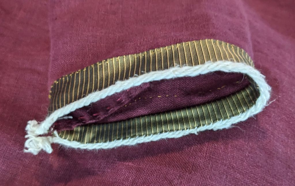 The cuff of the sleeve sometimes had a protective or decorative cord sewn on, as shown above, or it may have had a twined “cord” created by the woven treatment of the warp edge. (See Base Fabric and Fitting post.) I created a cord for this edging by plying strands of linen weaving thread together and sewed it onto the outer edge of the cuff. The same cord was used to edge the body “selvedges” and reinforce the edges of the open armpit.