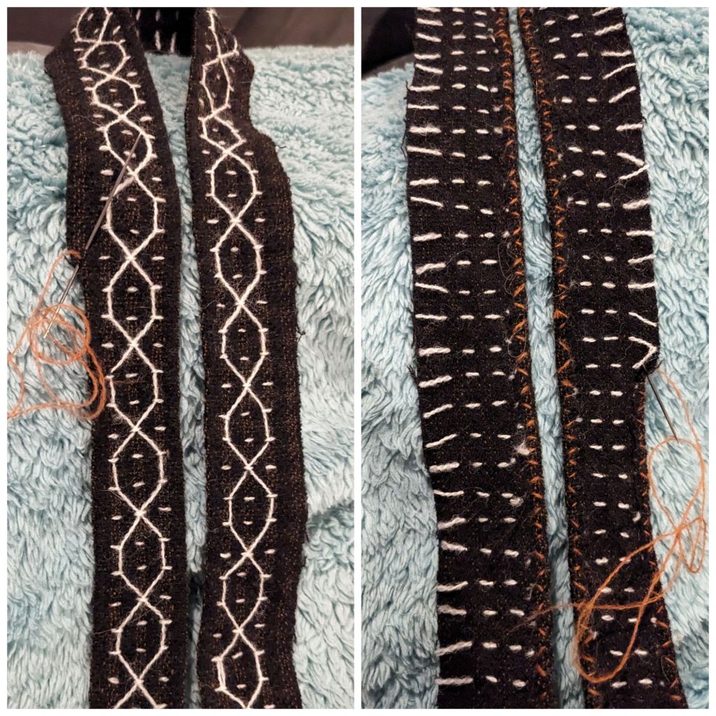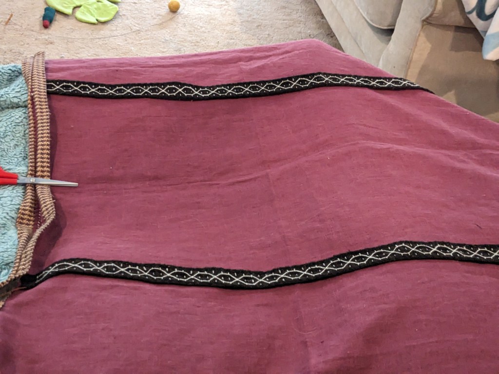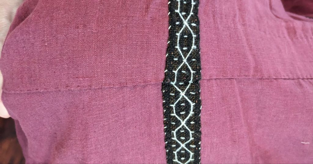 Once the edges were secured, they were ready to sew onto the tunic. One of the tips I found was to get all of the embellishment sewn on first before sewing up the sides of the tunic (Anna’s New Rome), so I did that for everything going on before the first event it was worn to.