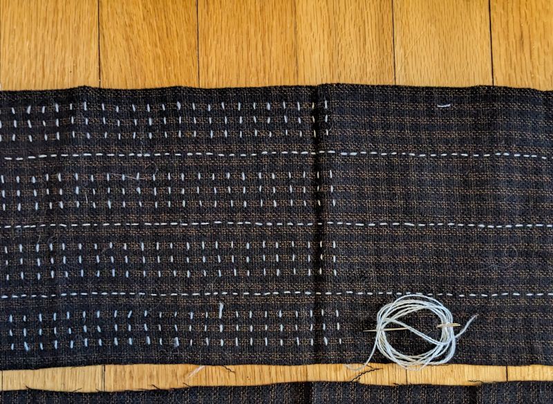 A widely spaced running stitch was an accurate option, but I wanted to keep the folded edges from unfolding, so I chose to use a more closely spaced whip stich (also an accurate option).