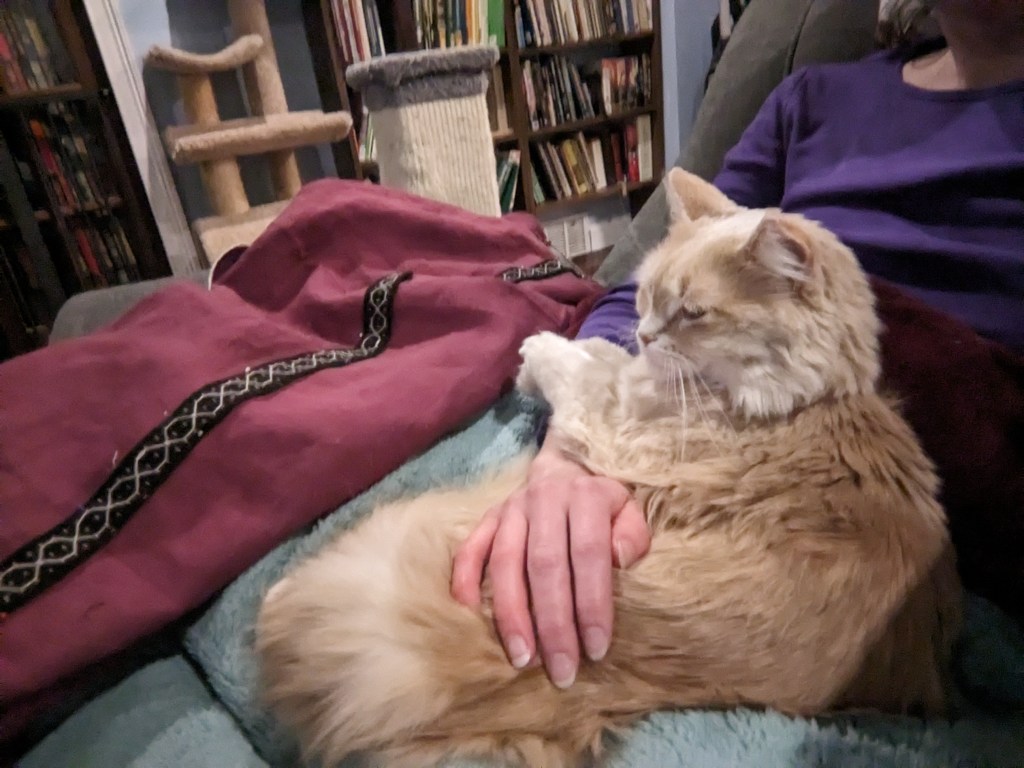 My clavi do not reach the bottom of the tunic because I simply didn’t have enough fabric in the right configuration to execute strips that long. I ended them with points instead. However, they are long enough that they pass the waist tuck (see Base Fabric and Fitting post), so I had to decide whether to sew them on before or after the tucking happened. There are examples of both, but ultimately it would be easier to pop out the tuck stitches and re-fit the tunic if the clavi were sewn onto the fabric first and folded along with the rest.