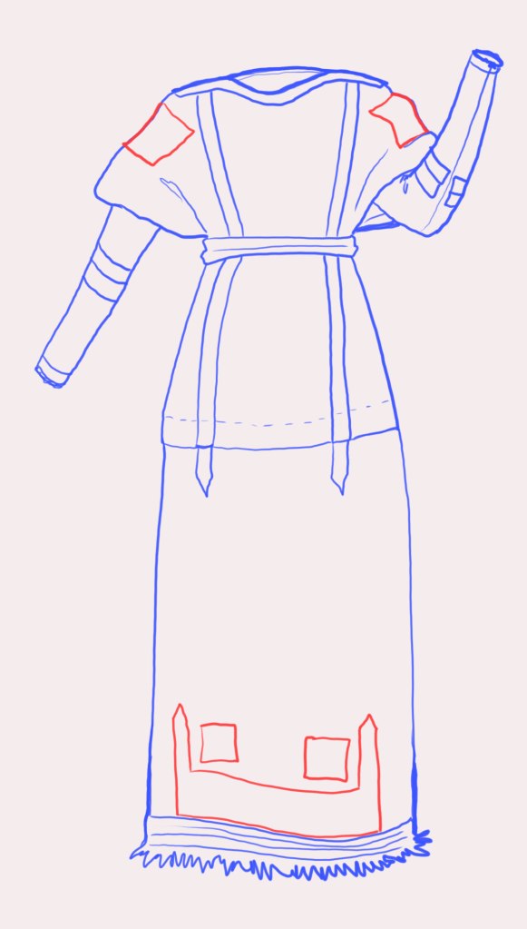 I have another chunk of the same ground fabric that I used for the clavi, which I plan to use to make matching elements for the bottom of the skirt. I did not have time to finish all of the pieces before the event I needed the tunic for, so I prioritized the pieces that would be the most difficult to sew on to an assembled tunic and decided to do the rest later. I also plan to weave square pieces (tabulae) to decorate the shoulders. Eventually, the pieces sketched here in red will be added to the design.