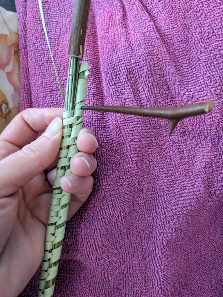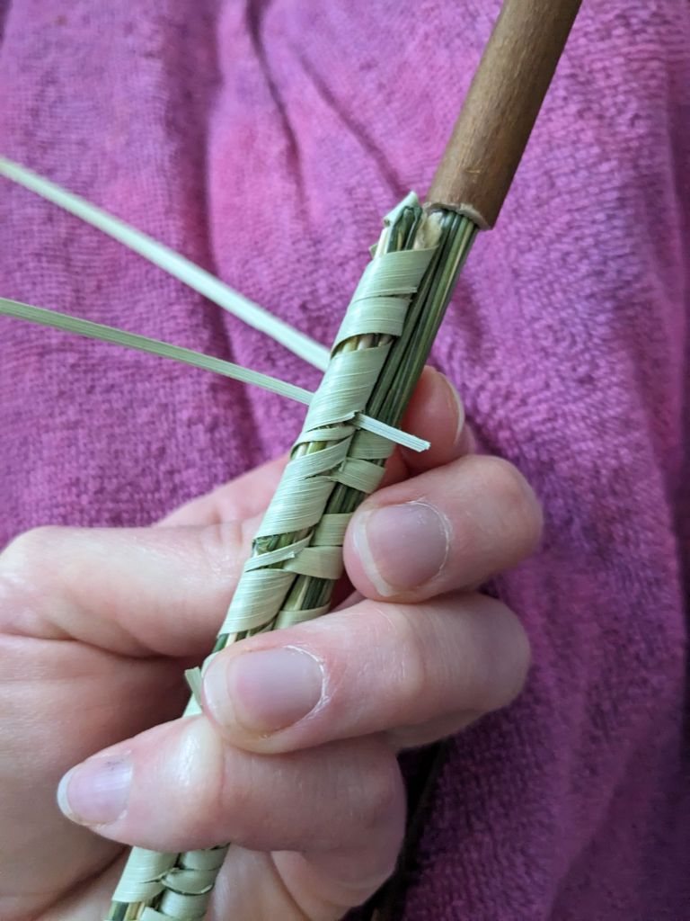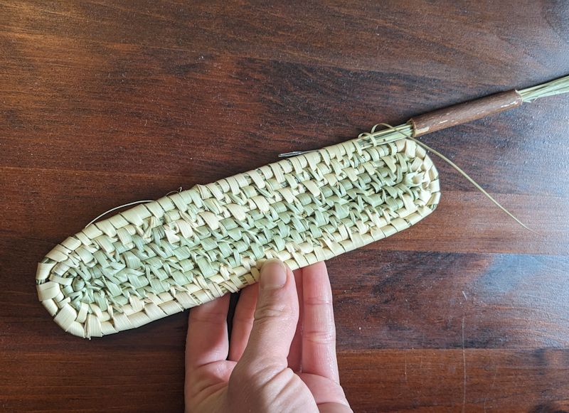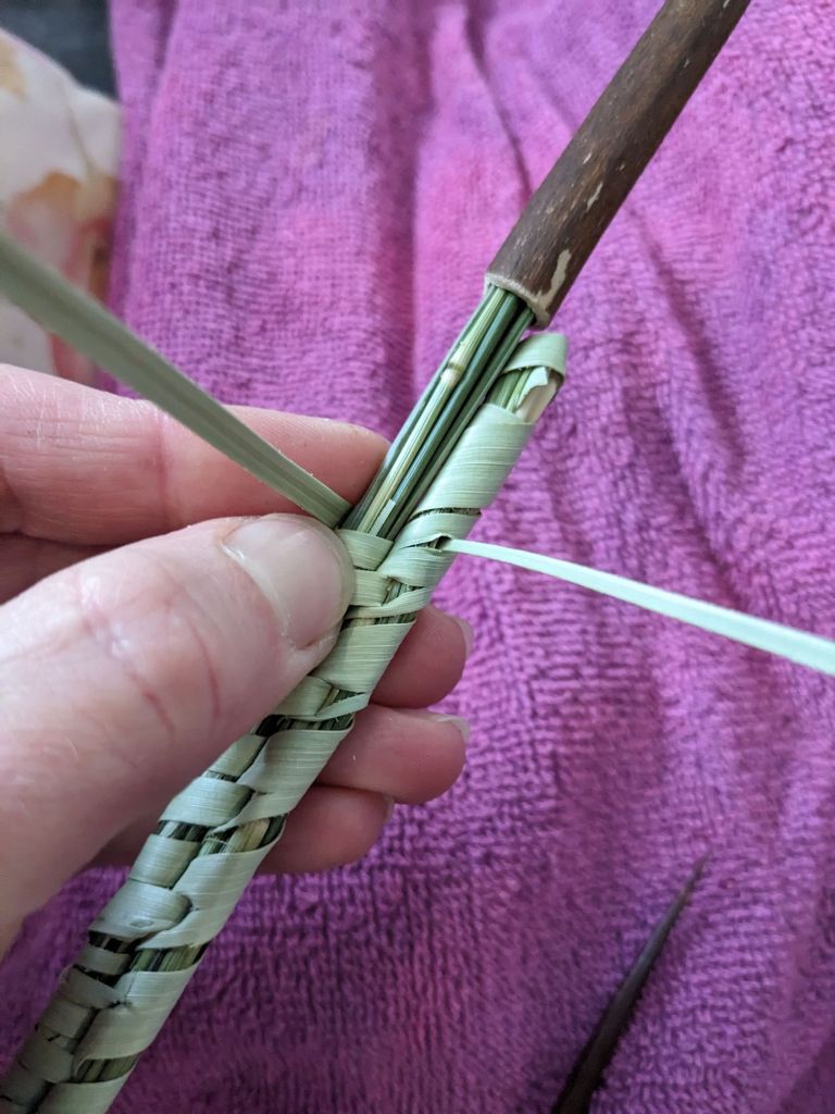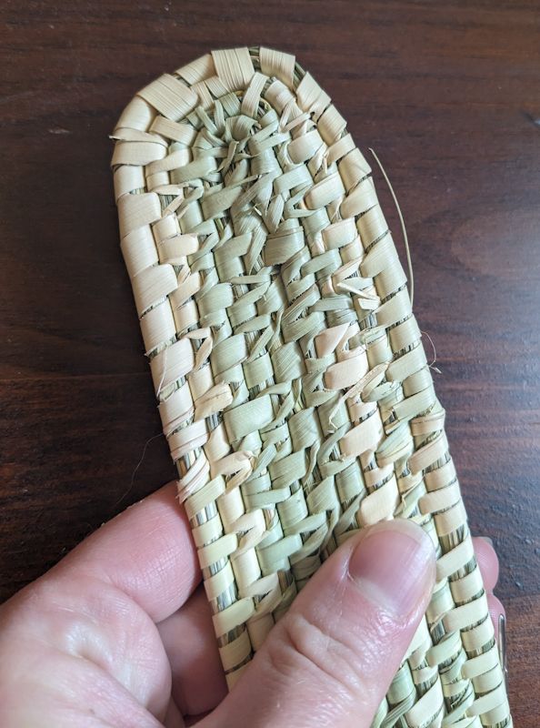 Rather than using a needle, I am making a hole to poke the palm strip through by using a large thorn as an awl. After I got a few rounds done, the shaping of the base got a whole lot easier. This was the point where I had to start really watching the points for increasing the number of stitches at each end to get a decent oval.