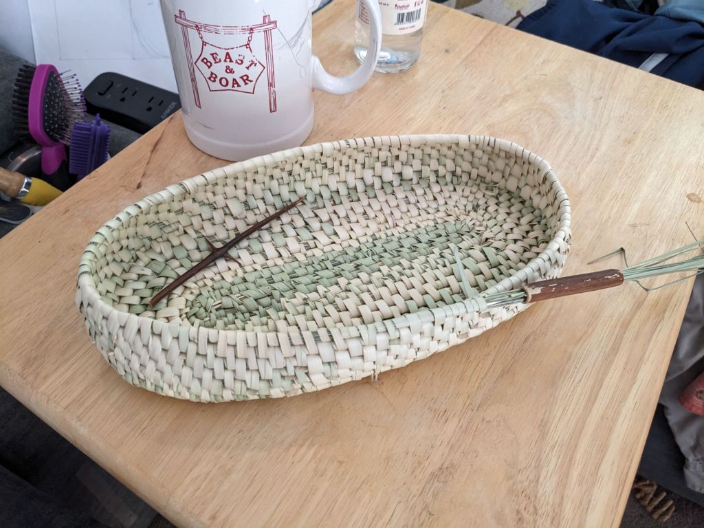 This particular project was started in early July, but it is still in progress because I switched to other things for a bit. I started my attempt to learn historical Egyptian basketry techniques by trying to create a lidded oval basket out of palm leaves and grass, based loosely on an extant piece at the Louvre. Specifically, these baskets were often made of doum palm and reed or halfa grass. (Wendrich, Willeke. The World According to Basketry, 1999. https://escholarship.org/uc/item/6n42w0rg.)