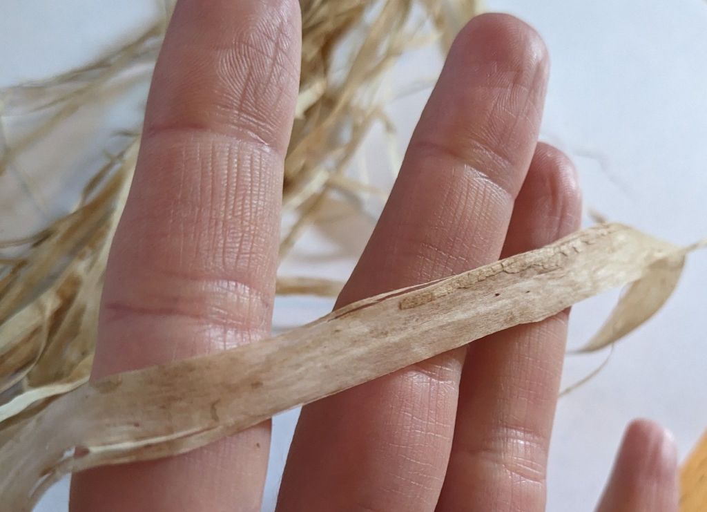 Peeled skin of the young, green shoots is easier to obtain and prepare, and it makes comparable cordage except for differences in the color and shine. I did prefer working with the batch I rinsed and squeezed out several times while fresh (the one pictured with the clip) over the one I did not clean, and it also had a slightly nicer end result.