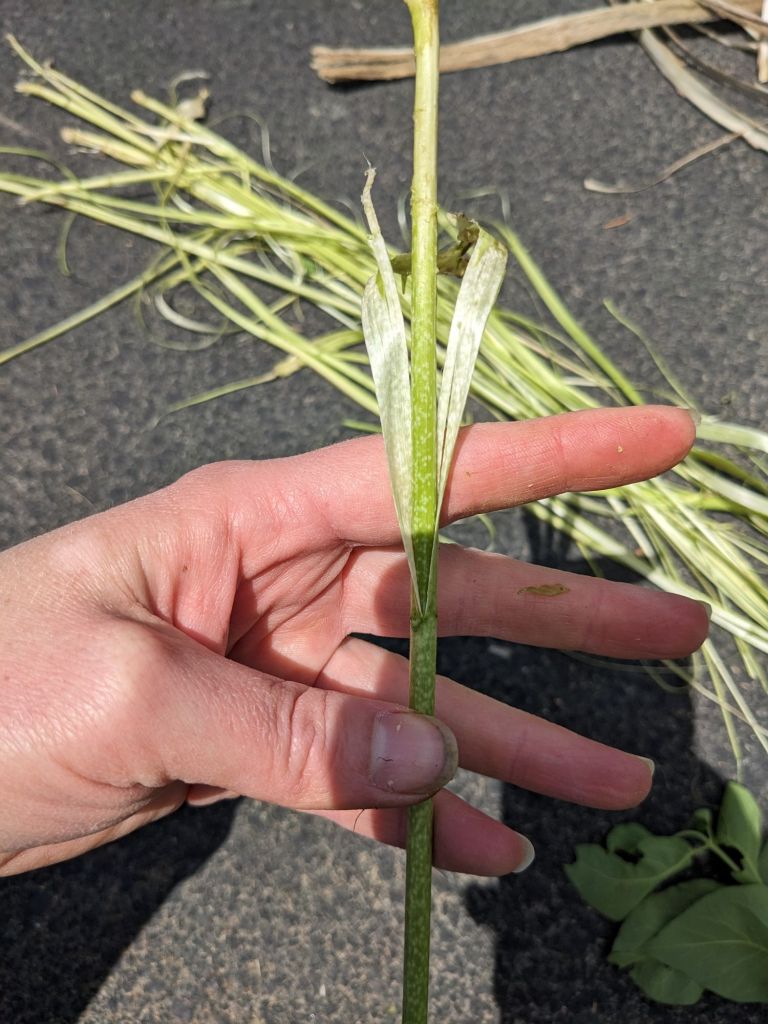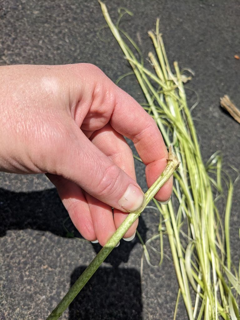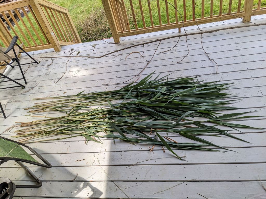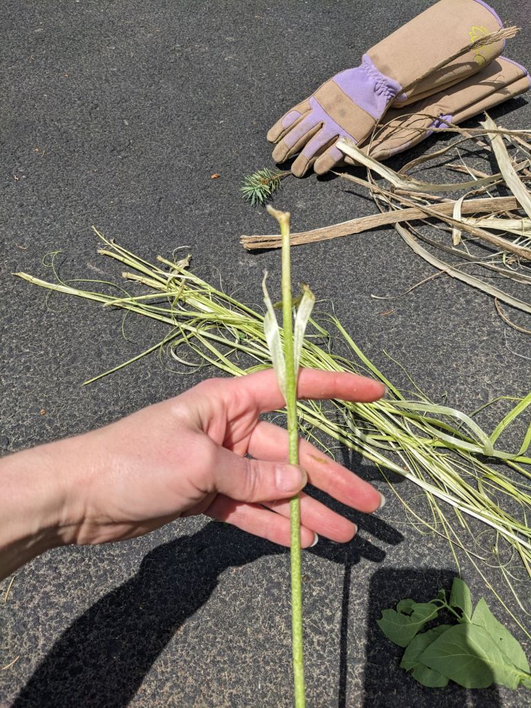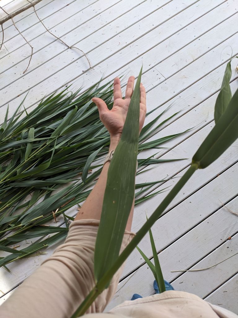 This large, invasive foxtail grass showed up in some garden soil I ordered and has been going strong ever since. I would be happy to deplete it an prevent it from reproducing so much. In addition to experimenting with the leaves for cordage, I recently started playing with splitting the longer stem sections to use like straw.