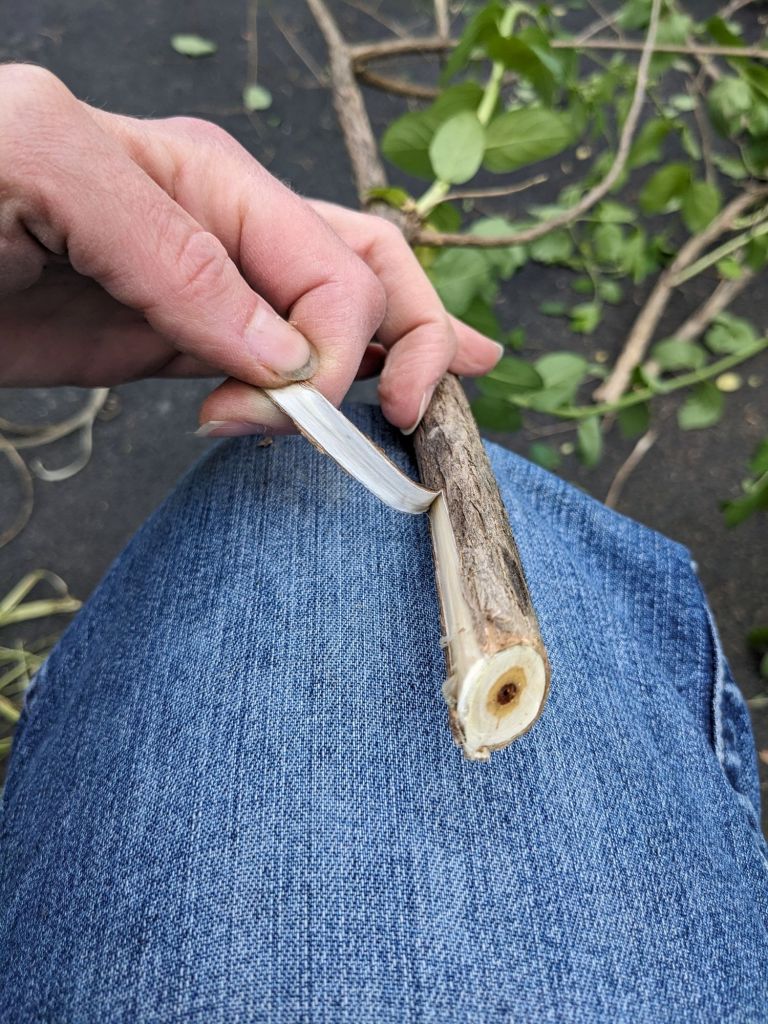 You can identify the invasive honeysuckle bushes easily by checking the inside of a branch to see if it is hollow like the one shown below. Our native kind does not have hollow twigs. Bast (inner bark) of older branches makes a soft, fine string. However, it is a bit rough on the hands separating it from the outer bark — it is easiest to let the stripped bark dry until just a little soft from humidity and them separate them.
