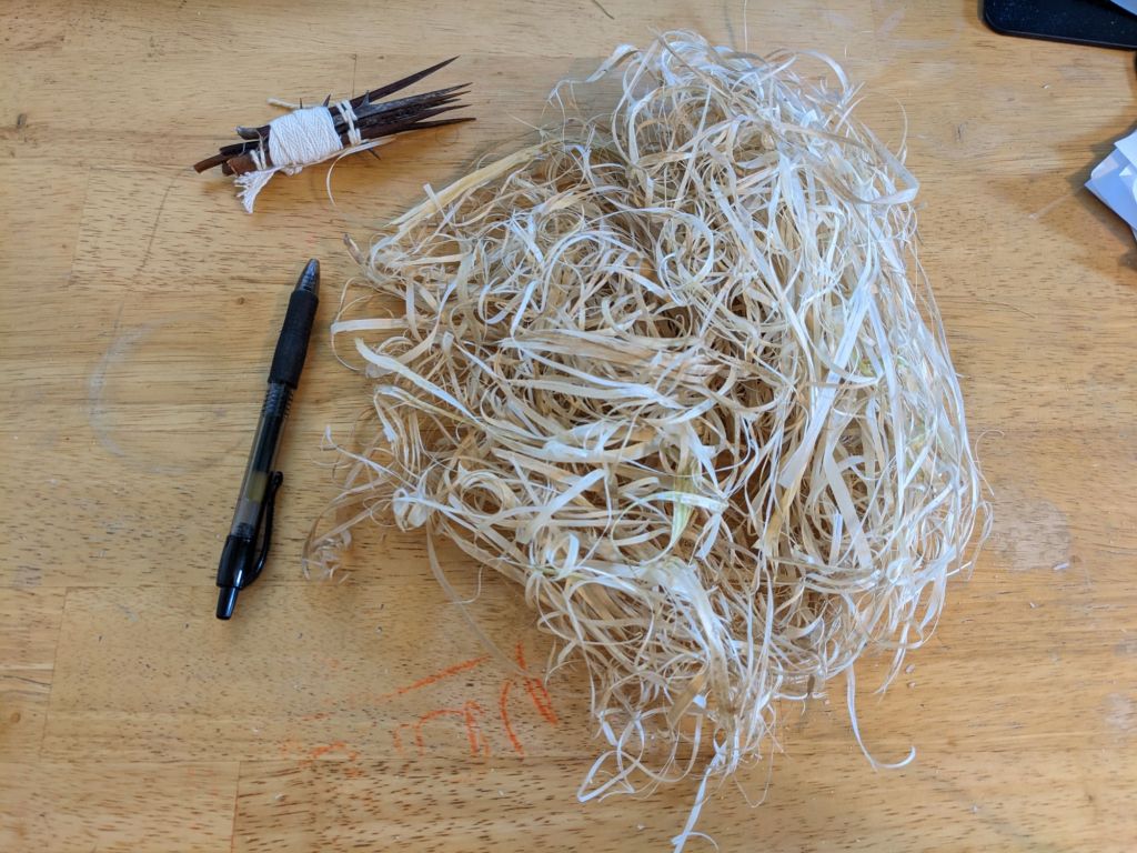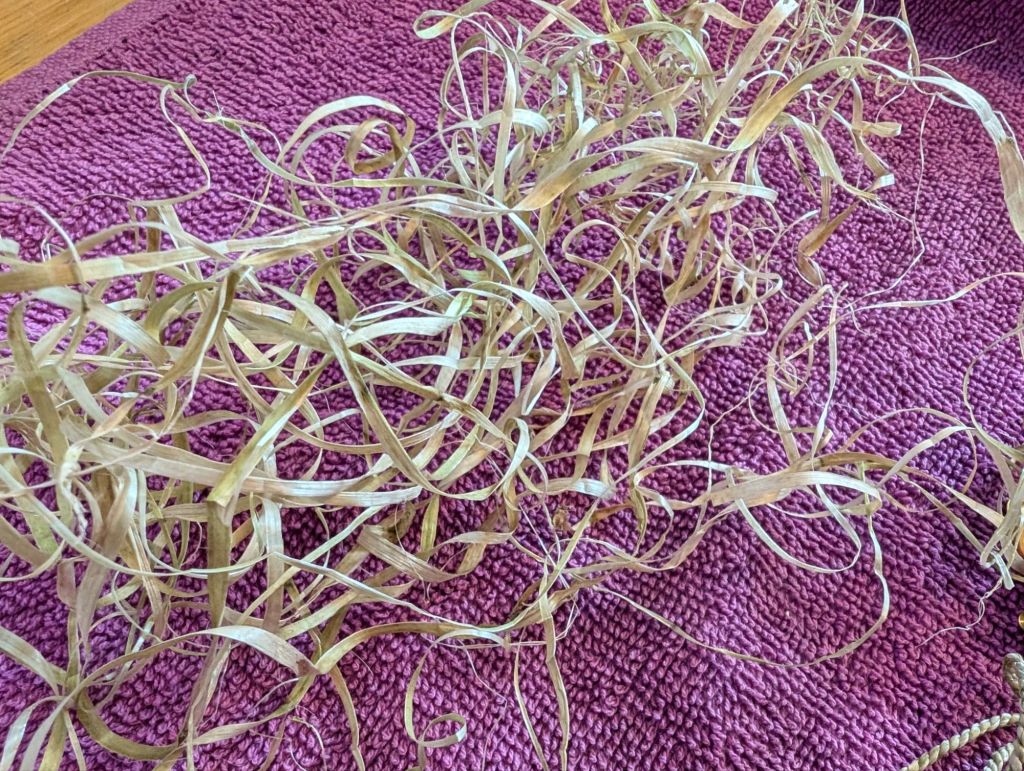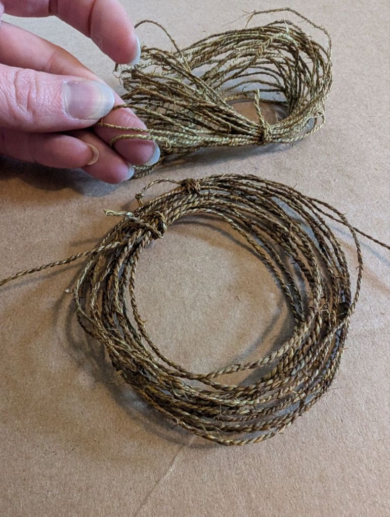 You can dry it or use the leaves fresh. There is very little shrinkage. The coil with more brown in it is made from leaves that were harvested after starting to fade and dried almost a year before making the cordage, while he bright green coils were made from fresh leaves or leaves that had been dry for only a week or so. There’s no noticeable difference between the green coils.
