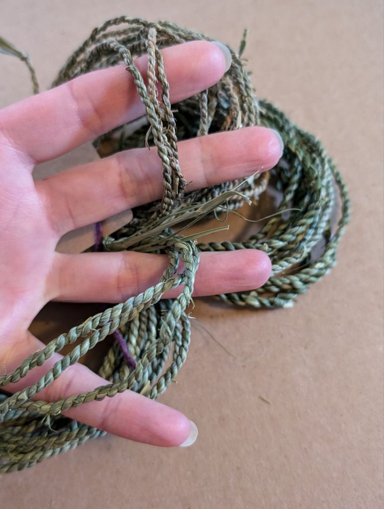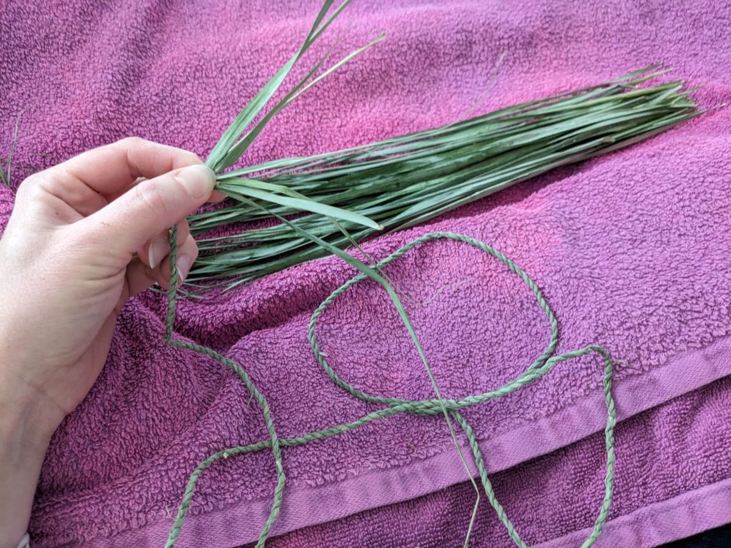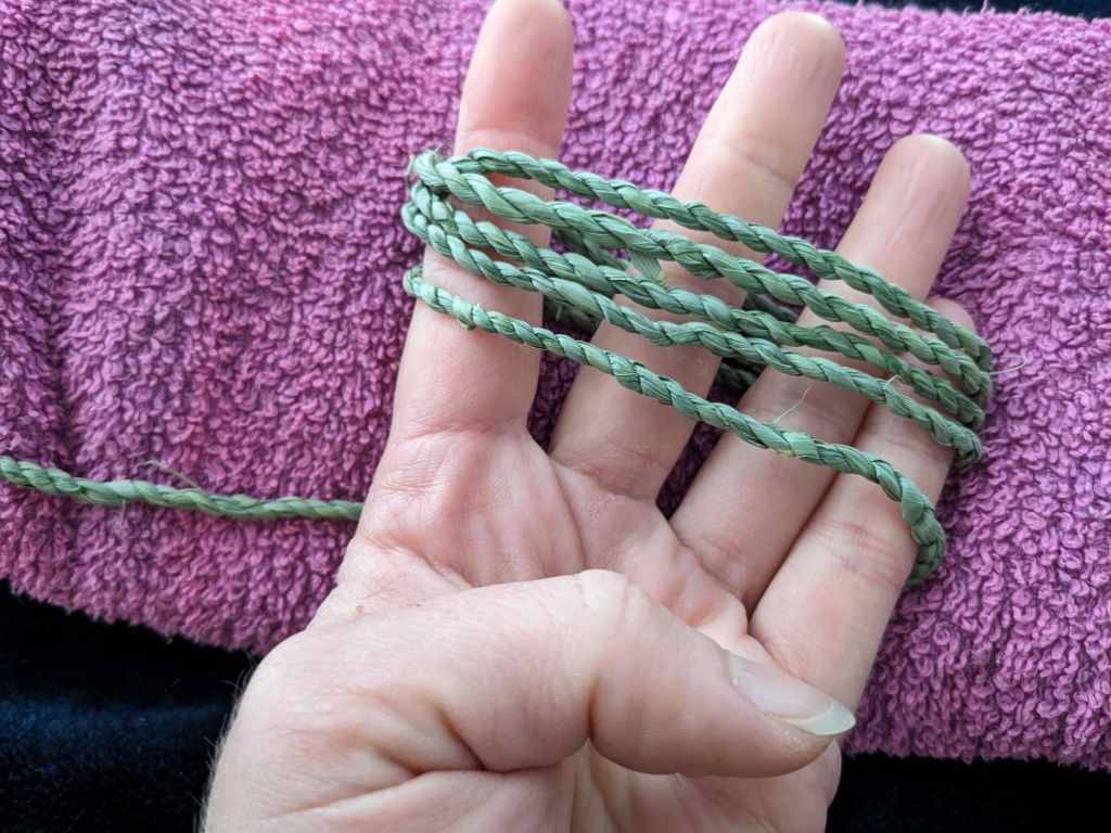 The stem can be used in basketry, but what about the leaves? They were so long I had to try using them before just letting them go to waste. They make acceptable medium sized cord, though it is a bit stiff and would probably not be good for fine applications. It is also fairly rough and a bit tough on the hands to twist up. The color is lovely, and I could see it working well in a basket.
