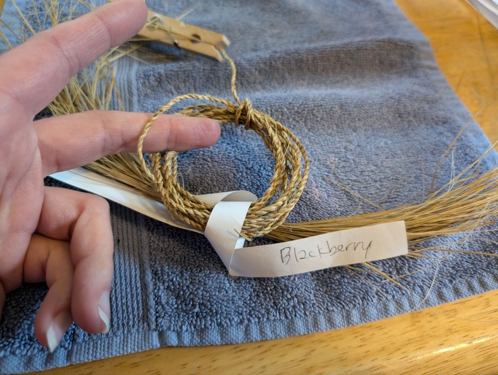 The blackberry cane resulted in a much coarser honey-colored fiber that made a very stiff twine that feels somewhat like horsehair and could probably be used for similar stiffening applications. Hard on the hands when twisting, but it is the only thing I’ve tried that feels this stiff without being brittle.