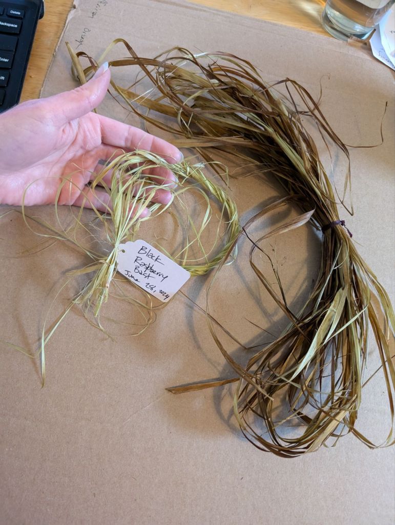 These canes can be native or invasive species, and I happen to have both hanging out around my yard. They also hybridize easily, so it’s quite difficult to nail down an exact species identification. As a general rule for telling them apart without flowers or fruits, raspberries have rounded canes that are smooth except for their prickles, while blackberries have ridges running the length of the cane. The time to harvest these is definitely before the end of June, at least in my area. At the end of June, I got nice green bast strips that came right off the outer bark from the black raspberry, but just a few weeks later I had to soak the bark for a week and then scrape the outer bark away (resulting in the brown color). The resulting cordage is fine and fairly soft, but it’s definitely not worth the amount of work it took to process the ones I cut in July!
