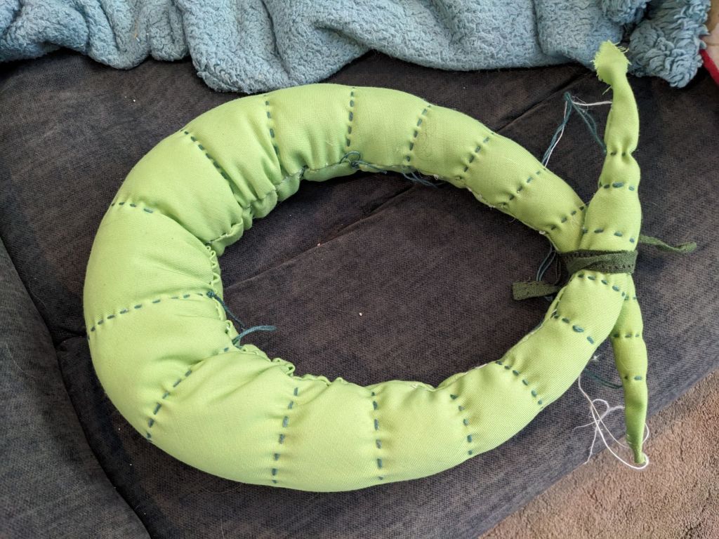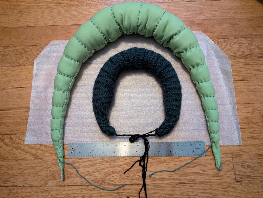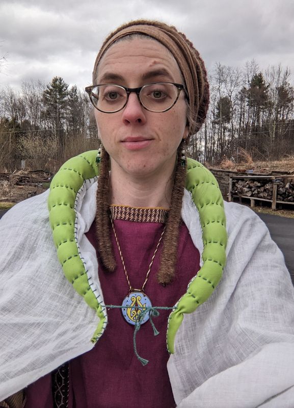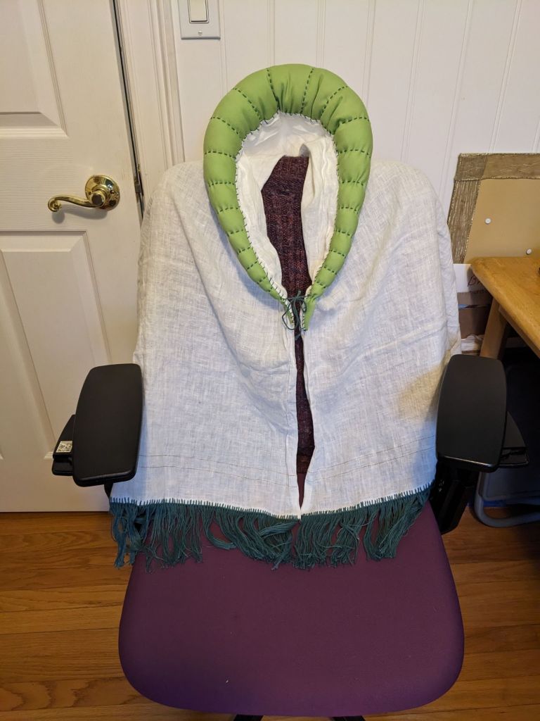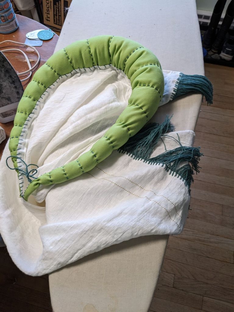 The large lime green headband below was the first one, made out of wool twill fabric in dimensions close to the museum objects and stuffed with neppy waste wool left over from combing. I sewed this to the edge of a lightweight linen shawl to test the physics.