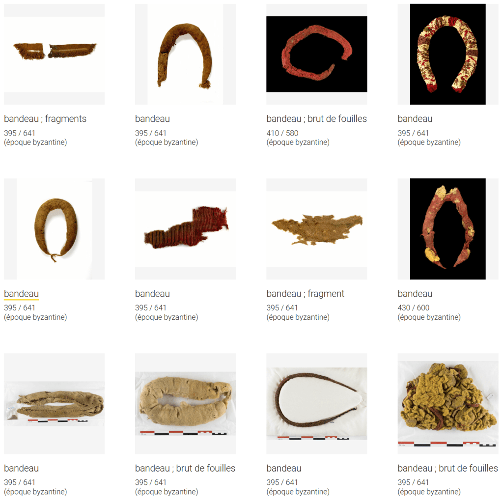 - Not pictured above: Excavation notes and photos from the tomb of Tgol show a ribbed yellow headband positioned around her head and attached to the edge of a hooded mantle which was draped over her face like a shroud and wrapped the rest of her body. (Diletta Minutoli, “Antinoe, Necropoli Nord 2007: la tomba di “Tg’ol”. Prime informazioni.” in Antinoupolis. I., Istituto Papirologico “G. Vitelli”. Scavi e materiali. vol. 1 61-73.) A grayscale photo of the mantle and attached headband is available here, at Figure 16.