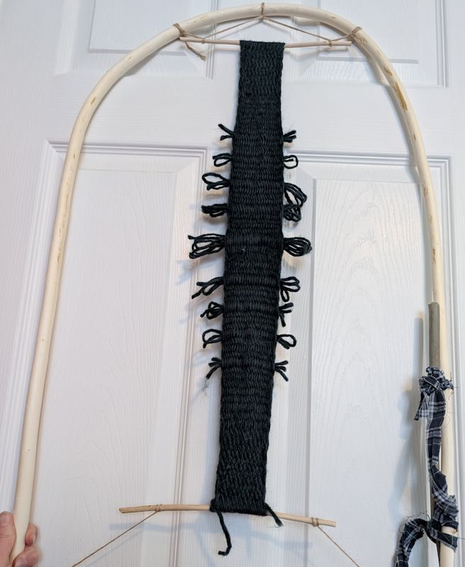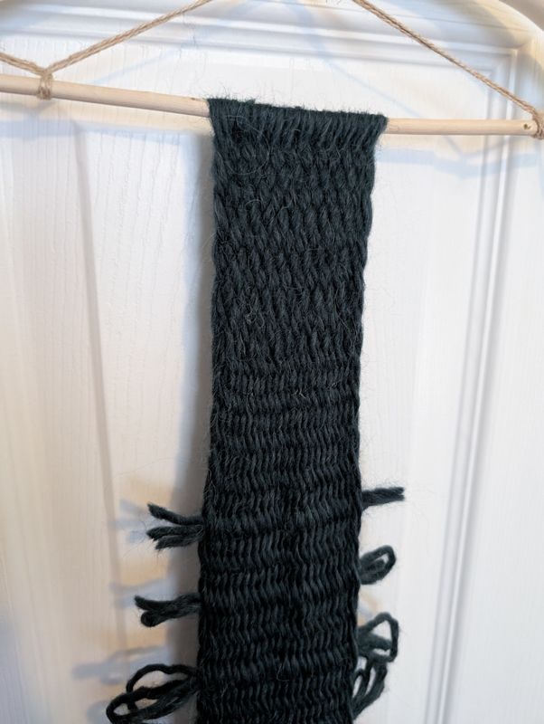 This week, I made the dark green headband below in sprang interlacing using bulky wool and miniature dimensions to test out some techniques and learn how the fabric and the transition between 1/1 interlacing and 2/2 interlacing behaves. I just learned how to do sprang interlacing, so this was good practice.