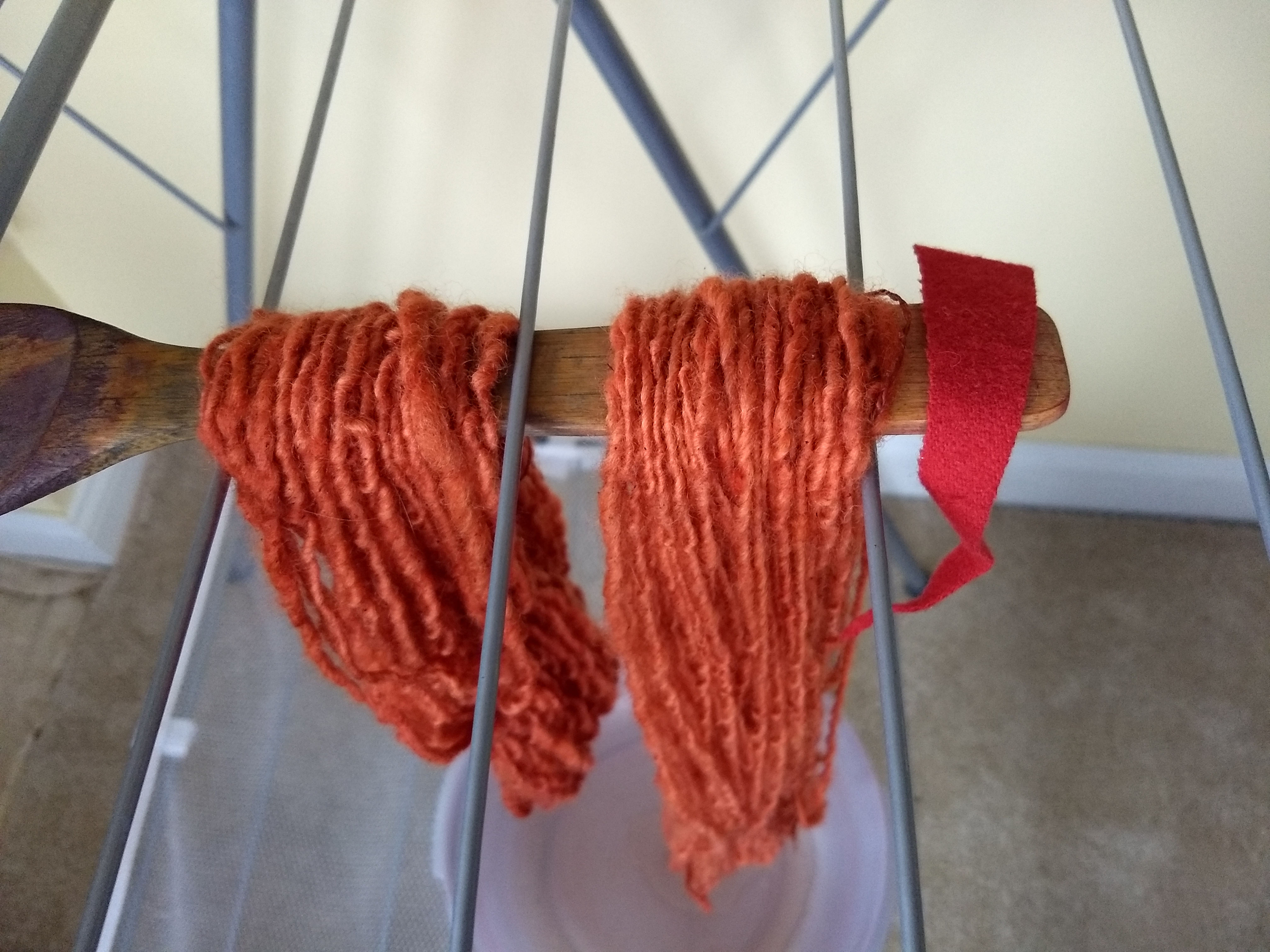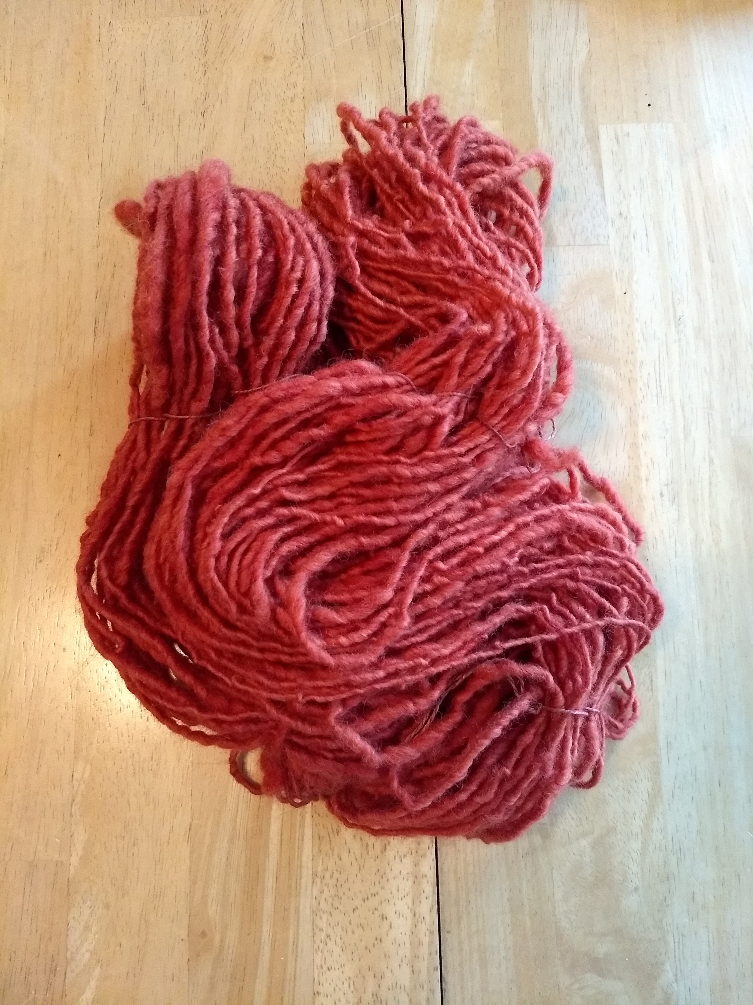 This hat was created for my Laurel’s elevation to the Order of the Pelican when I was his student (prior to taking a belt). To match his persona, it is a naalbinded hat made with handspun wool singles from a fleece I washed and prepared myself. For the red color, I dyed most of the yarn with madder root.