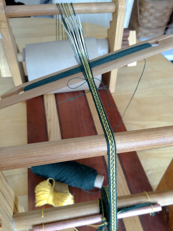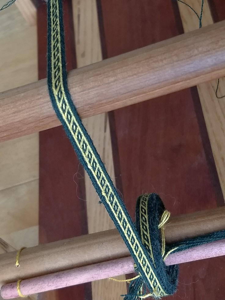 Another attempt at a tablet weaving pattern; this time I tried the Narrow Oseberg Band using information from Shelagh Lewins’s site. This one doesn’t have a built-in way to remove built up twist, so I ended up having to reverse the pattern periodically because I chose to use a frame loom.