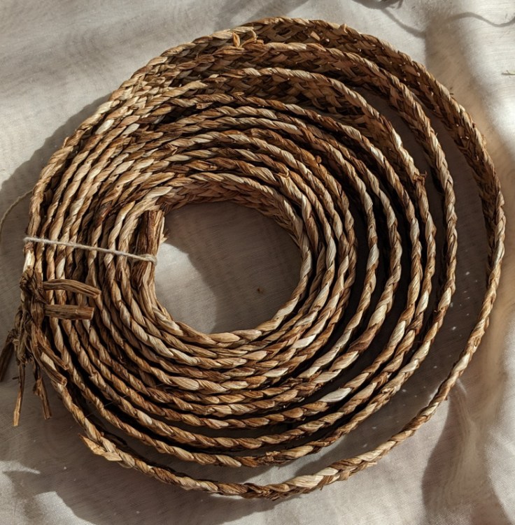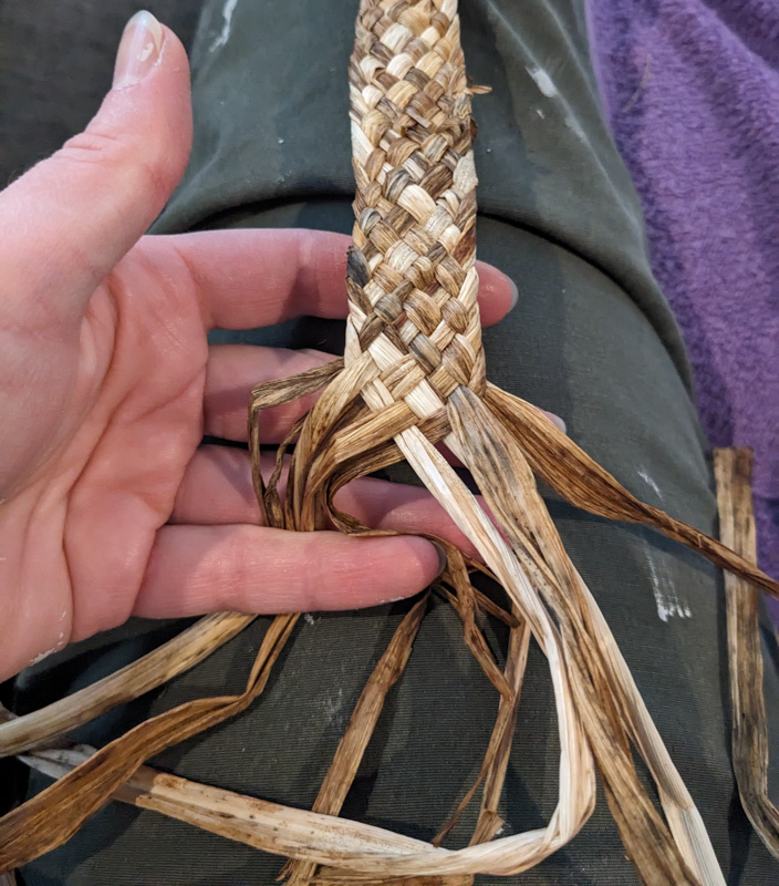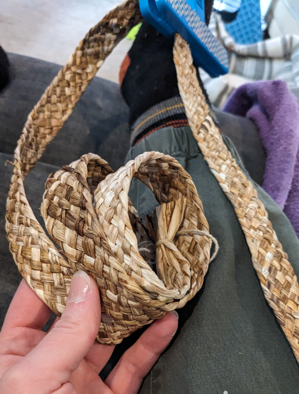 Baskets and mats made from sewn plaited strips are a style of historical basket that is still produced in Egypt today. They are typically made from palm leaflets, but I am experimenting with other materials since palm does not grow where I live. I had some extra soaked daylily leaves to use up, so I decided to to try weaving them into a plaited strip. Seven strands gave me a decent width, and after some trial-and-error I was able to successfully join new leaves in when old ones were coming to an end.
